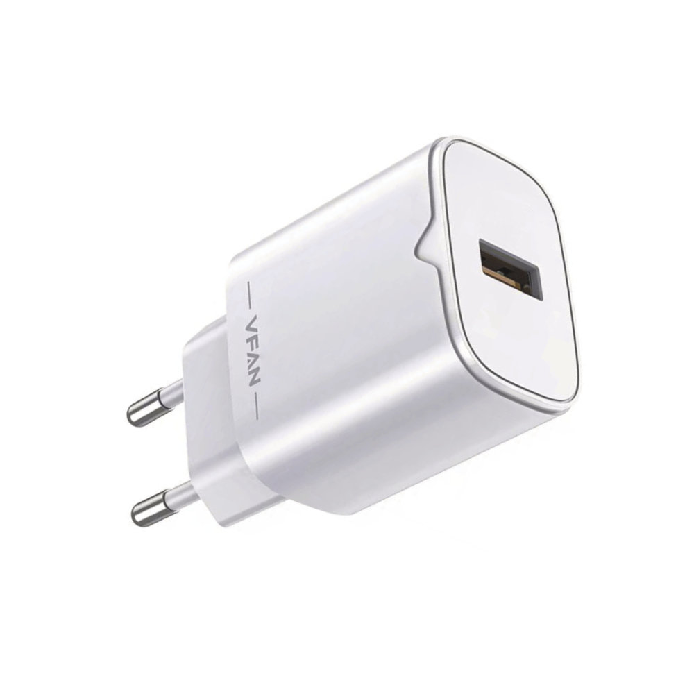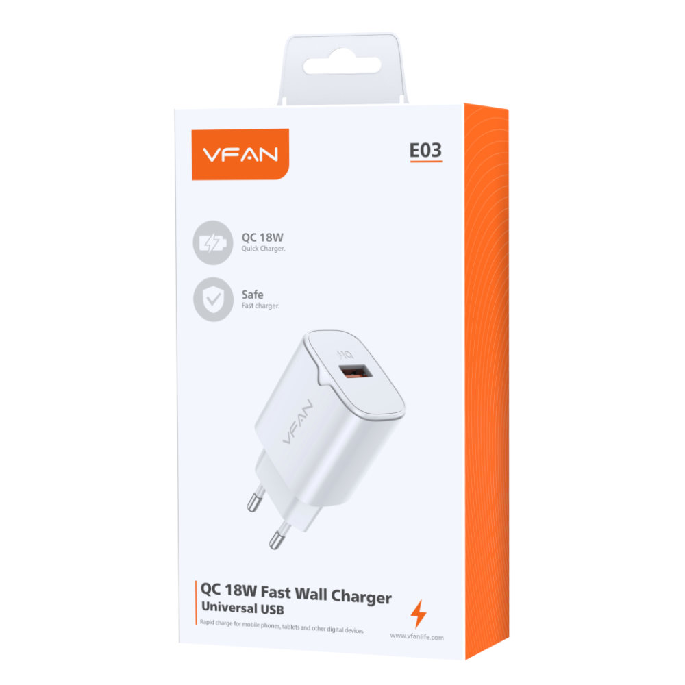 Carregador USB de 18W com suporte para Quick Charge 3.0. Inclui circuitos de proteção contra sobrecarga, sobreaquecimento e sobretensão. Suporta perfis de carregamento de 5V-3A, 9V-2A e 12V-1,5A.