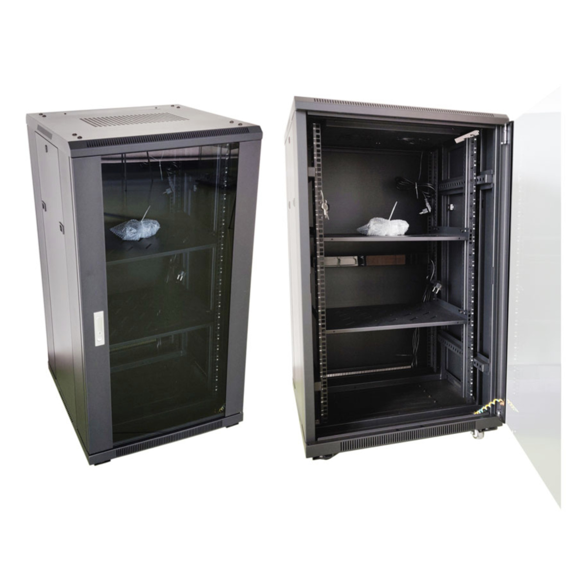 Armário rack profissional de 24U, robusto e funcional, ideal para instalações de redes, telecomunicações, servidores e sistemas de videovigilância. Estrutura sólida, ventilação integrada e fornecido com acessórios essenciais para instalação imediata.