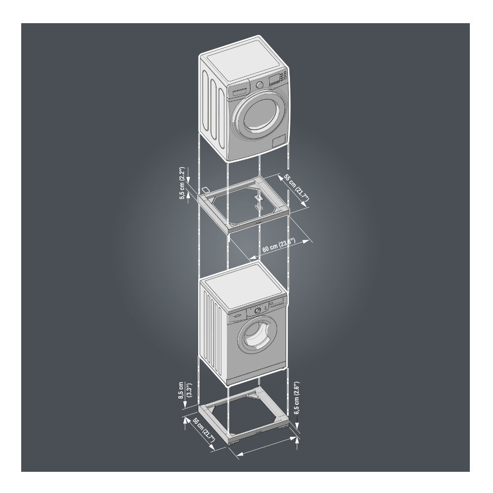 Universal e compatível com todas as máquinas de lavar e secadoras de carga frontal de 60 cm de largura, com uma distância máxima entre os pés dianteiros e traseiros de 54,5 cm. Também é compatível com secadoras de até 70 cm de profundidade. O kit de sobreposição para lavadora e secadora vem pré-montado e é muito fácil de instalar, incluindo uma cinta de segurança para maior estabilidade.