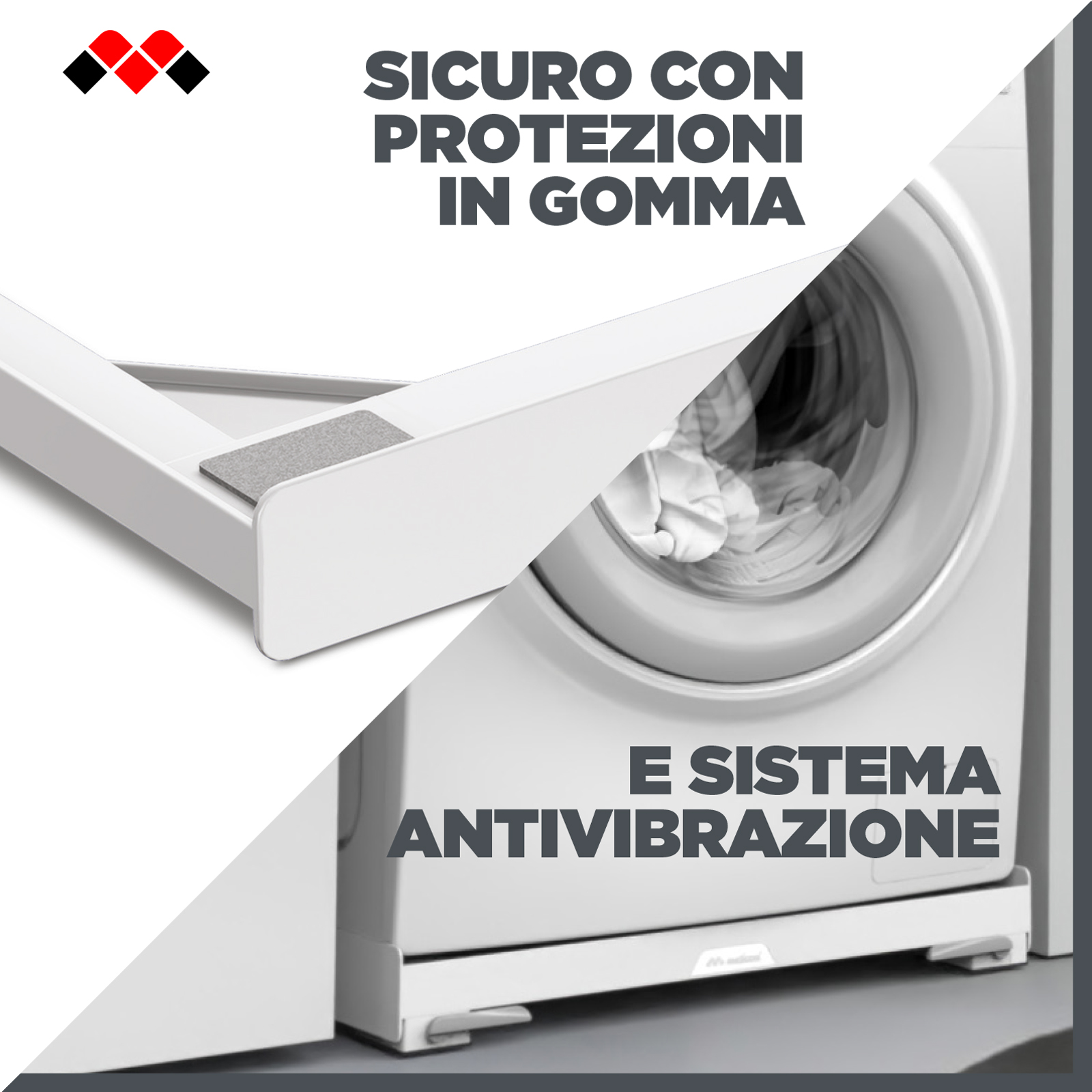 Kit 2 em 1: base com rodas para facilitar a movimentação da máquina de lavar e kit de sobreposição Meliconi para empilhar a secadora, otimizando o espaço na lavandaria