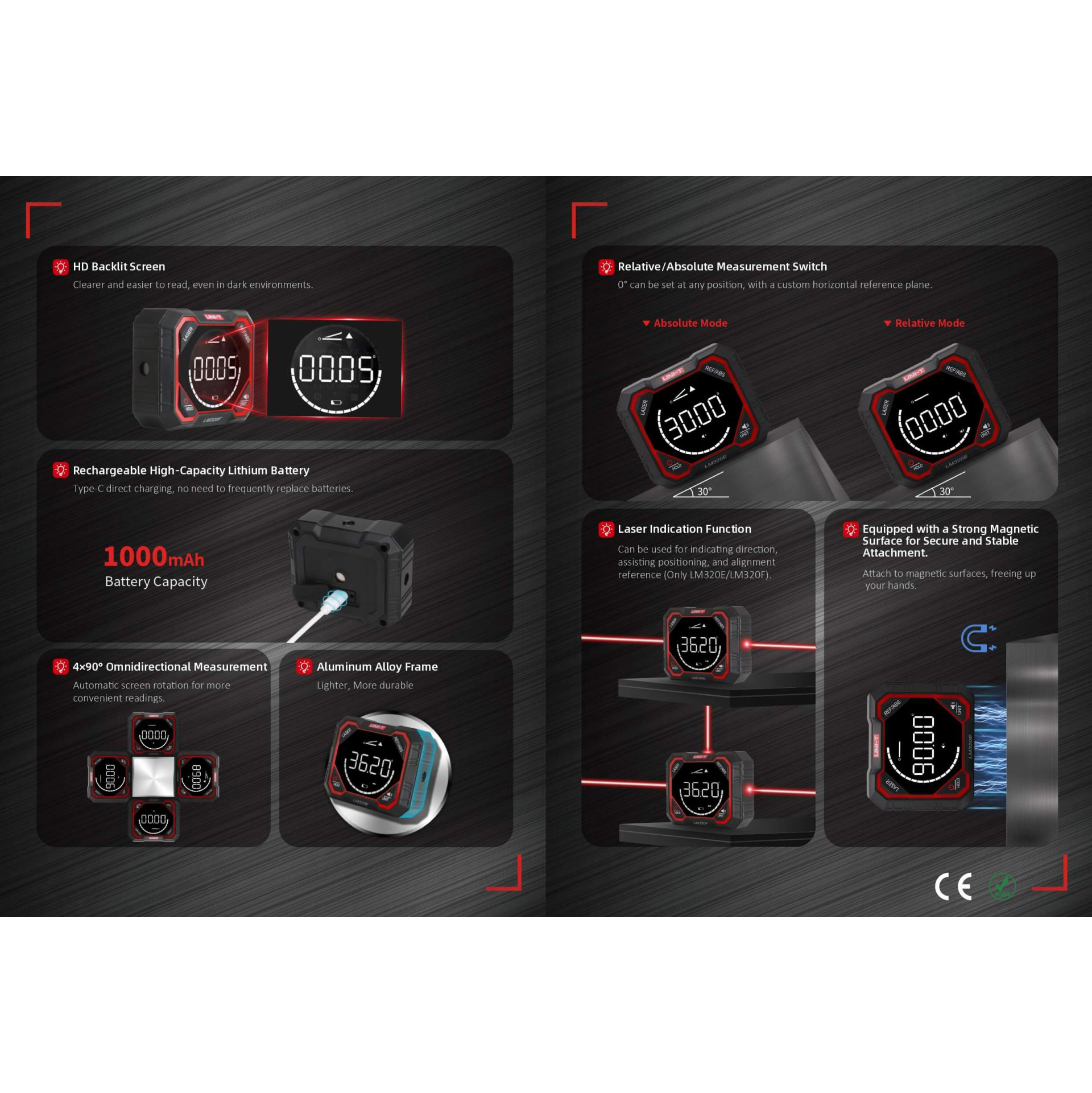O LM320D é um medidor de ângulos digital (inclinómetro) de alta qualidade, ideal para aplicações profissionais e trabalhos DIY. Construído com estrutura em liga de alumínio, combina resistência, leveza e portabilidade, garantindo medições rápidas e fiáveis em qualquer situação.