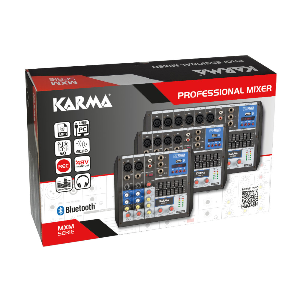 Mesa de mistura compacta com 6 canais, 4 sinais balanceados (linha ou microfone), 1 canal via RCA (linha) e 1 sinal digital (leitor MP3 ou bluetooth). Possui equalizador gráfico de 7 bandas e efeito de eco que pode ser inserido nos microfones. Nos primeiros 2 canais podem ser conectados microfones condensadores via XLR, graças à alimentação phantom. A ficha USB permite a conexão a um PC e assim a mesa de mistura passa a funcionar como se fosse uma placa de som!