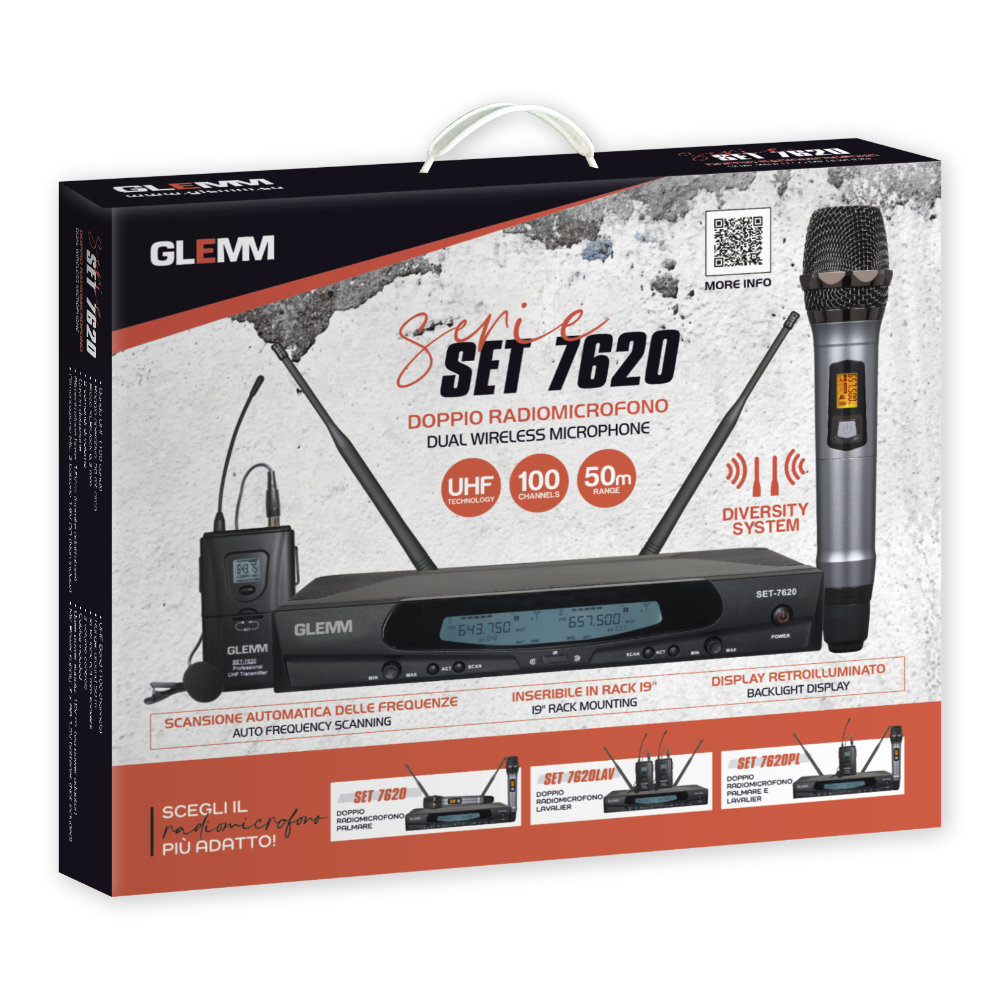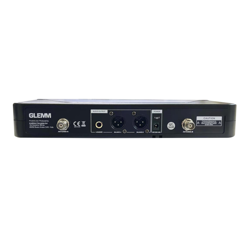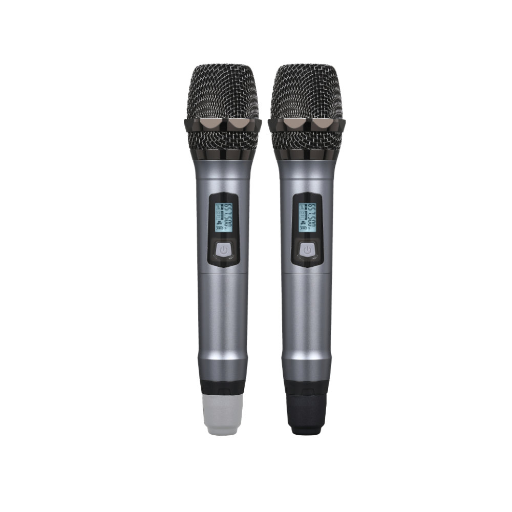 Microfone sem fios UHF profissional, com base receptora e microfones transmissores de mão incluída. O visor mostra todas as informações. 100 canais disponíveis, o acoplamento de frequência ocorre em poucos instantes via sensor infravermelho. Opera na banda UHF com filtros especiais que eliminam interferências. Os microfones também estão equipados com visores a partir dos quais podem ser visualizadas várias informações, como o nível de carga das 2 pilhas de 1,5V.